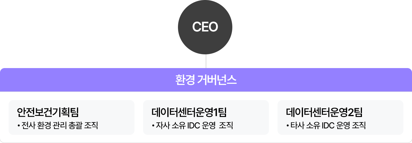 환경LG CNS는 환경 리스크를 예방하고 환경경영 실천을 위한 조직체계를 갖추고 있습니다. 전사 환경경영 총괄 조직인 안전보건기획팀은 기후변화 전략 수립, 배출권거래제 대응 등을 담당하고, 데이터센터 운영 조직에서는 에너지, 용수, 폐기물 등의 환경 지표들을 관리하고 있습니다. 또한, 이사회, 정기 회의체 등을 통해 주요 환경 실적 및 이행계획을 보고하고 있고 대내외 이해관계자들의 요구에도 체계적으로 대응하고 있습니다.