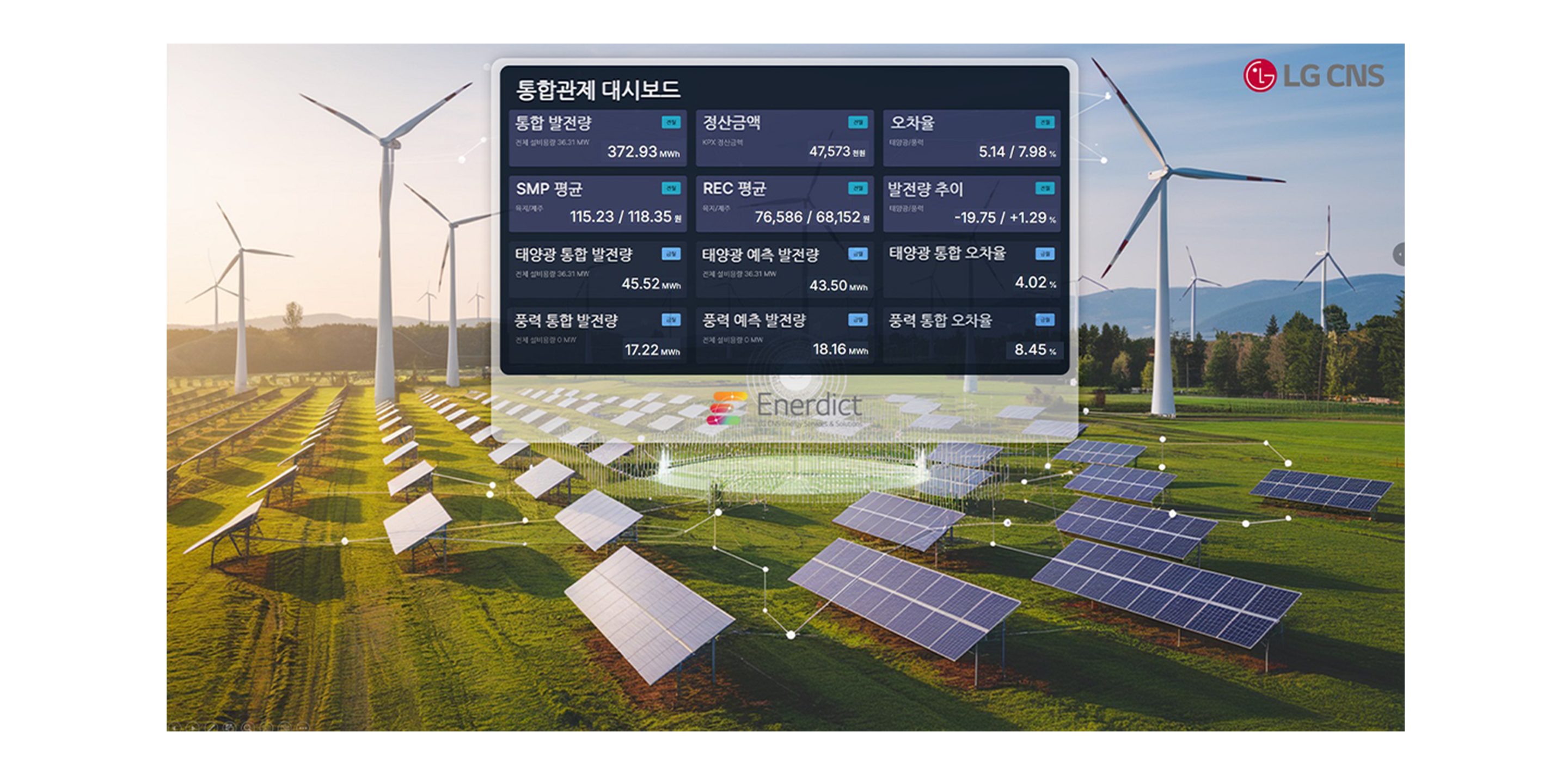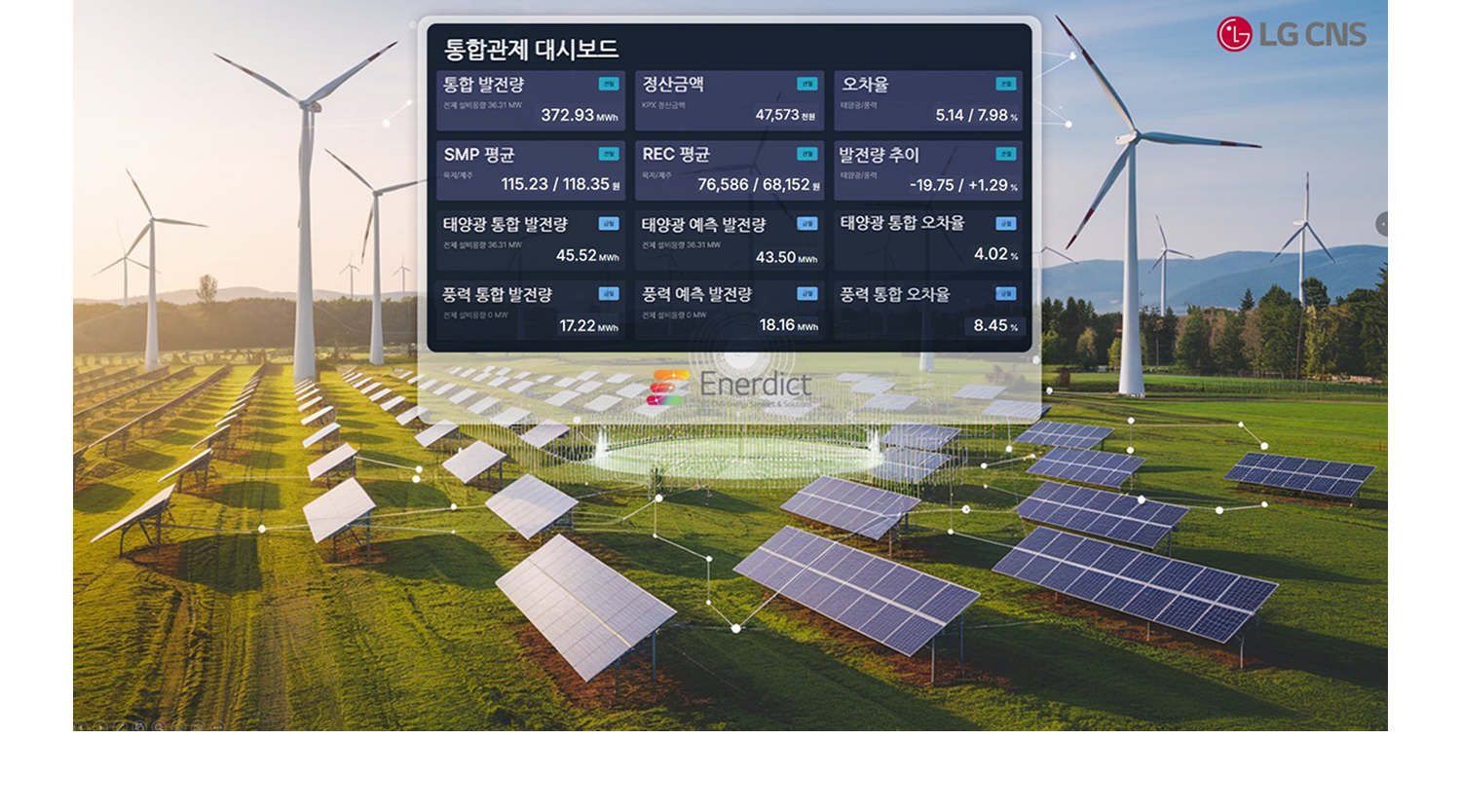 LG CNS는 발전 자원의 효율적 운영과 탄소 배출 저감을 위해 AI 기반 통합발전소 운영 최적화 솔루션 Enerdict를 개발하였습니다. Enerdict는 태양광, 풍력, 연료전지 등 다양한 발전 자원의 발전량과 전력시장 가격을 예측하고, 이를 기반으로 최적의 발전·저장 전략을 수립하여 운영 효율성과 수익성을 극대화합니다. 본 솔루션은 기상 예보, 설비 상태, 전력 시장 데이터 등을 종합 분석하며, AI 모델 기반 예측 결과를 실시간 시각화함으로써 발전소 운영의 안정성과 대응력을 높이는 데 기여하고 있습니다. 향후에는 발전소 외에도 건물·산업단지 등 에너지 수요처까지 적용 범위를 확대하여, 지속가능한 에너지 전환을 위한 AI 기반 관리 체계 확산을 추진하고 있습니다.