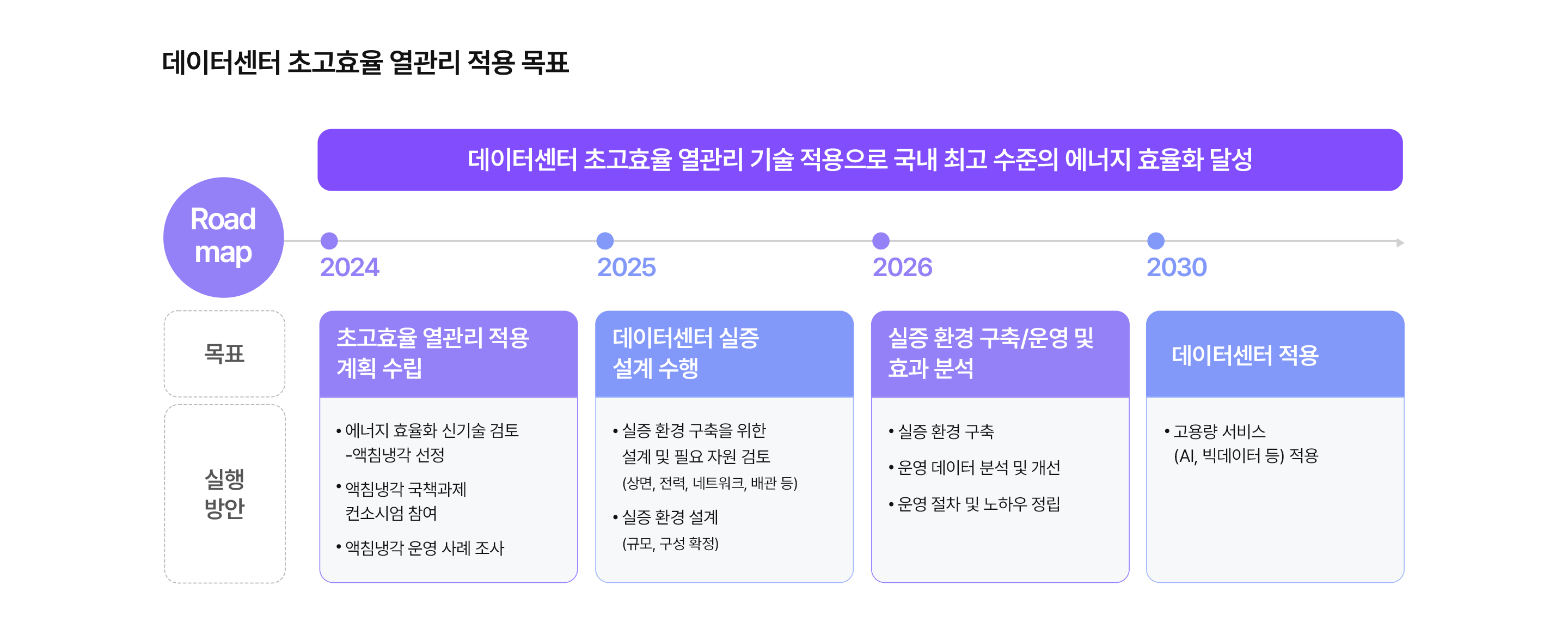 AI 기술의 발전과 함께 AI 모델의 학습과 실행에 필요한 컴퓨팅 자원 증가와 클라우드 서비스, IoT 기기, 스트리밍 서비스 등 많은 양의 데이터를 처리하고 저장해야 하는 서비스 확대로 데이터센터의 전력 사용량은 지속적으로 증가하고 있습니다. 이를 위해 LG CNS는 AI, 빅데이터, IoT 등 미래 기술의 성장을 뒷받침하는 핵심 인프라인 데이터센터의 친환경 실현을 위해 초고효율 열관리 기술인 액침냉각 도입을 추진하고 있습니다. 고성능 컴퓨팅 장비에서 발생하는 열을 효과적으로 제어하면서 에너지 절감을 도모할 수 있도록 기술 검토 및 실증 환경을 단계적으로 구축 중이며, 이를 통해 성능과 안정성을 검증하고 운영 역량을 확보해 향후 본격적인 적용을 준비하고 있습니다.